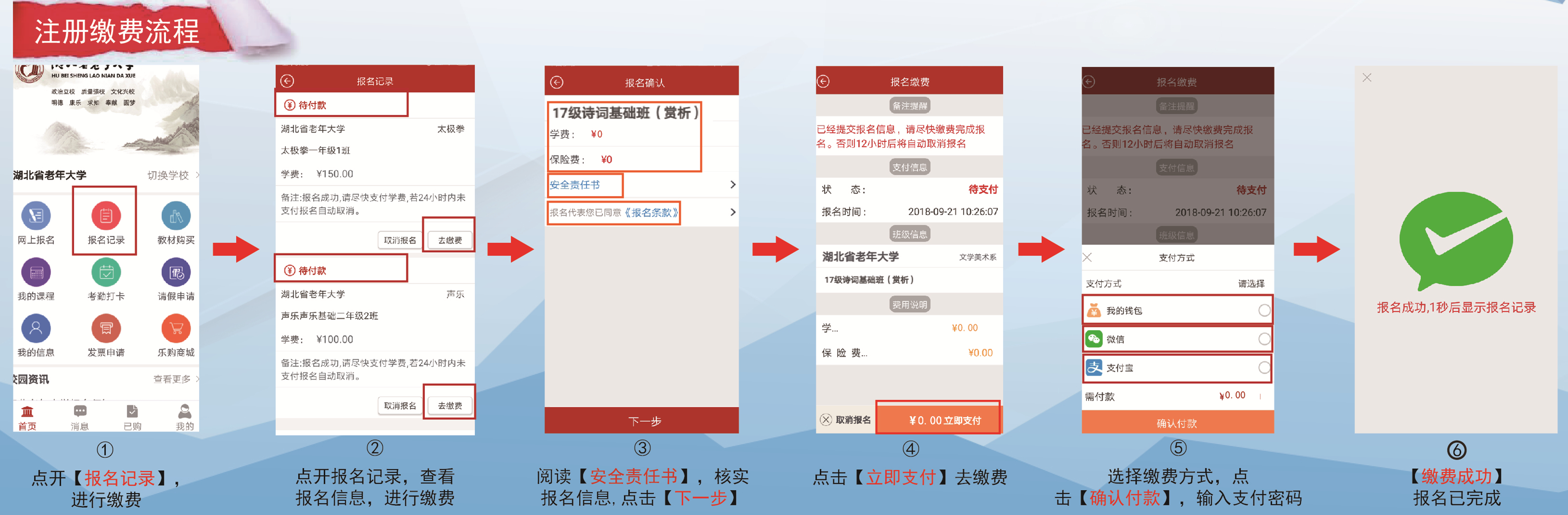 2020年学员注册工作将于1月14日至15日展开,本次注册对象为2019年未结业班级的在籍学员。操作流程如下:登录“荆楚乐龄APP”→点击“报名记录”→点击“去缴费”→点击“下一步”→点击“立即支付”→选择支付方式→缴费(注册完成)。