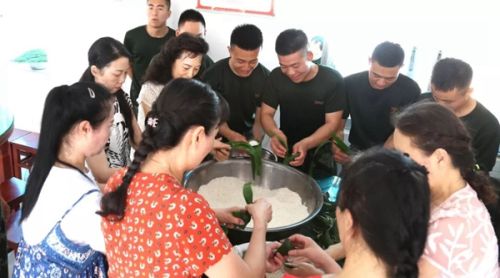 看到现场有包粽高手,战士们自然不放弃学习的机会,各自纷纷寻师学艺,只见他们一个个言传手教,一个个细心领会,现场犹如大家庭画卷。