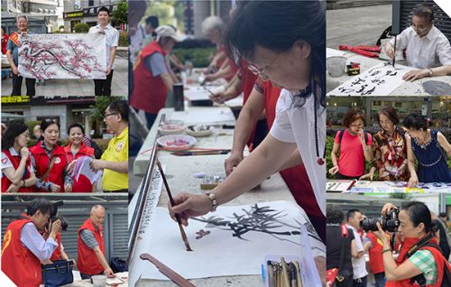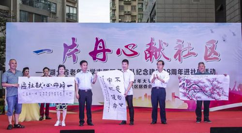 下午4点半,活动正式拉开序幕,现场热闹有人气,服务项目丰富有意义。书画联谊会、茶艺班、花卉班、布艺班的学员和团队员们,在活动现场进行书画创作赠送活动和茶艺、手工布艺、花卉养殖知识的讲解,校医务志愿者则在活动现场对大家进行养生和老年病相关问题的答疑解惑,切实满足了社区老同志的现实需要。志愿者们和居民朋友有说有聊,脸上纷纷洋溢出快乐的笑容,呈现出一片和谐友爱的画面。