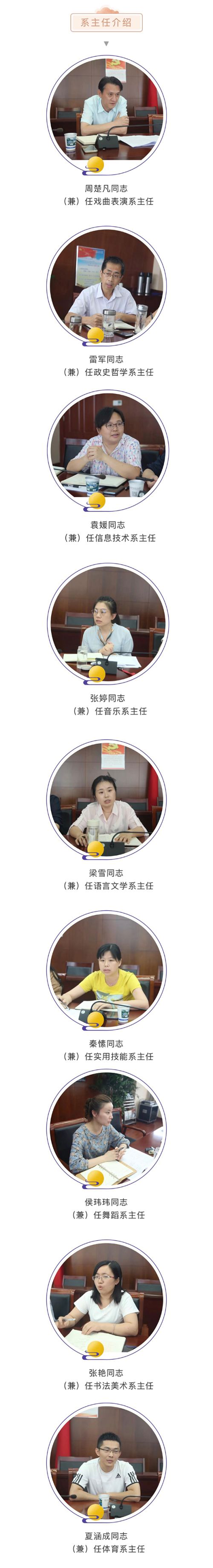 本学期,我校对教学管理体制进行改革,更好地服务师生,减少教学服务中间环节,各班级不再设置教辅人员,全面实行系主任责任制。经校长办公会研究同意,周楚凡同志(兼)任戏曲表演系主任;雷军同志(兼)任政史哲学系主任;袁媛同志(兼)任信息技术系主任;张婷同志(兼)任音乐系主任;梁雪同志(兼)任语言文学系主任;秦愫同志(兼)任实用技能系主任;侯玮玮同志(兼)任舞蹈系主任;张艳同志(兼)任书法美术系主任;夏涵成同志(兼)任体育系主任。系主任负责本系日常教学管理工作、教师队伍建设、班级学员管理等各项工作。